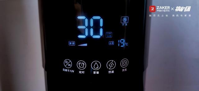 操作方式上,除了支持在機身上觸摸操作外,還支持遙控器操作。機身中部采用了黑色的隱藏式顯示屏設計,可顯示溫度、濕度、霧量、定時等信息。顯示屏下方設置了五顆觸摸式按鍵,分別可為負離子/UV、定時、霧量、恒濕、開關,可通過觸摸按鍵對加濕器的功能進行調整,但由于加濕器操作區位于機身中部,操作時需彎腰或者蹲下,操作上姿勢并不是很舒服,也可以使用自帶的遙控器進行操作。
