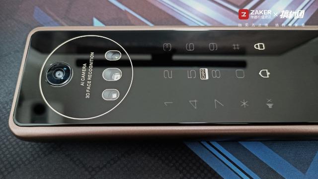 看看外側面板的細節,面板上部則是這款門鎖最引人注目的地方。上面一個碩大的175°超廣角鏡頭,下面則是人臉識別模組。這里的人臉識別模組區別一般手機的二維圖像人臉識別,而是一塊3D結構光人臉識別模組。