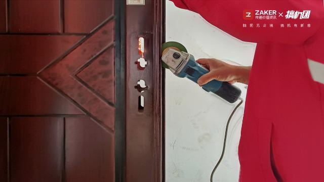 安裝過程中可以看出師傅技術非常精湛,經過對原始鎖框的切割改造,新鎖很快就安裝上去了。不得不說X7S配上我家的豬肝色門還是很搭的。