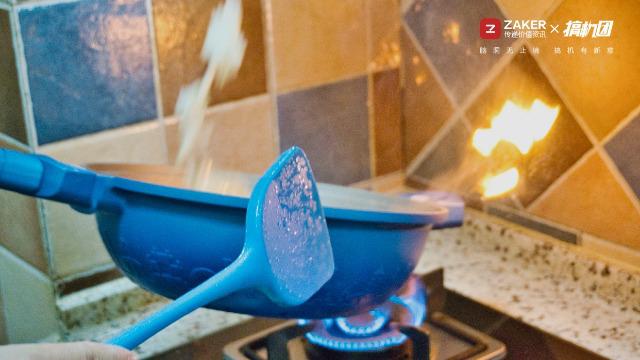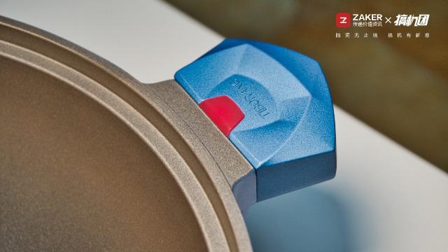 鍋耳外層有隔溫材料,摸起來手感很好,類似于硅膠的手感。兩個鍋耳中間紅色位置為感溫材料,加熱前為深紅色,變為淡紅色時表示已達140℃,可以進行烹飪,再也不用使用滴水或者姜片等試鍋溫了,這點好評。