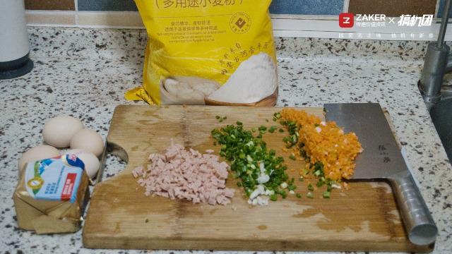 準備碎的胡蘿卜碎、午餐肉碎、蔥花碎、雞蛋、黃油和面粉以及牛奶用來和面。