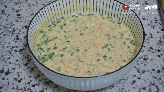 先把雞蛋打出來同時用微波爐打化黃油,兩者攪拌,加入適量面粉,然后加入牛奶和成面糊,最后加入胡蘿卜碎、午餐肉碎、蔥花碎攪拌均勻。