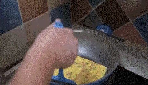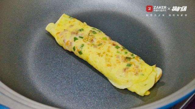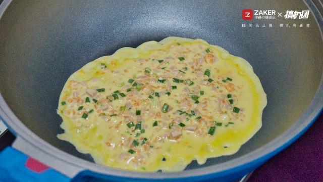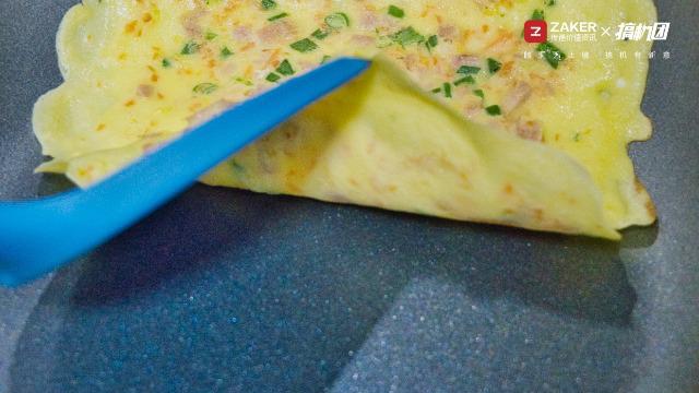 等待10幾秒就可以用鍋鏟鏟一下四周,然后顛鍋翻轉蛋餅,再煎十幾秒就可以將面餅折疊。
