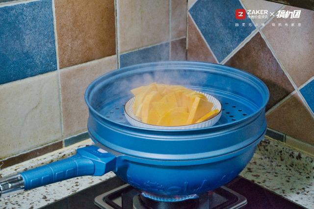 在燉排骨期間可以同時開始切南瓜,然后放上不沾蒸格,將南瓜放入不沾蒸格,燉排骨和蒸南瓜兩不誤,一鍋當兩鍋用!