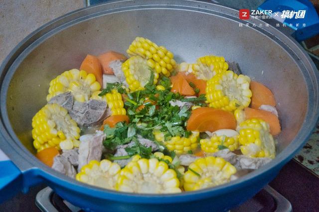 將一半排骨撈出,加入甜玉米和滾刀切的胡蘿卜塊,再燉五分鐘,加入蔥花香菜就可以出鍋了。