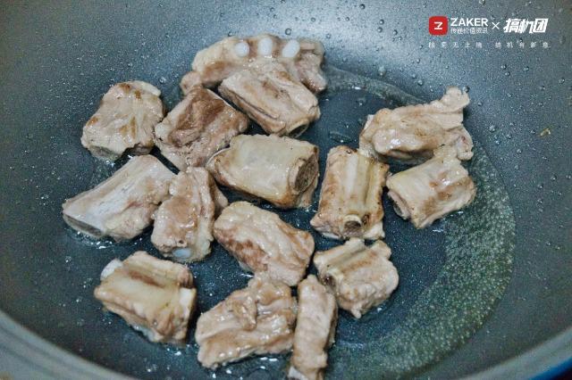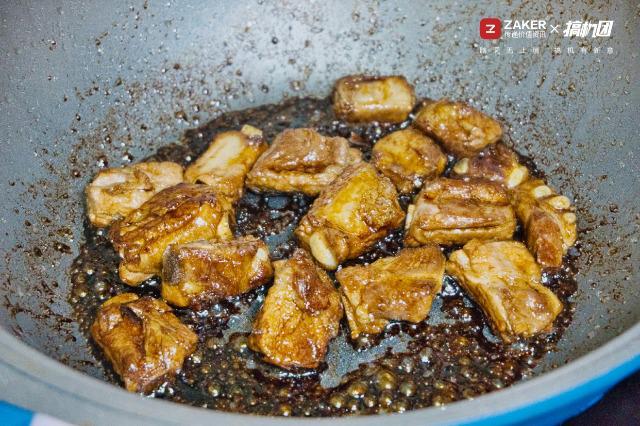 接著洗鍋,加入少許油,將排骨翻炒變色,然后接入白糖翻炒融化。