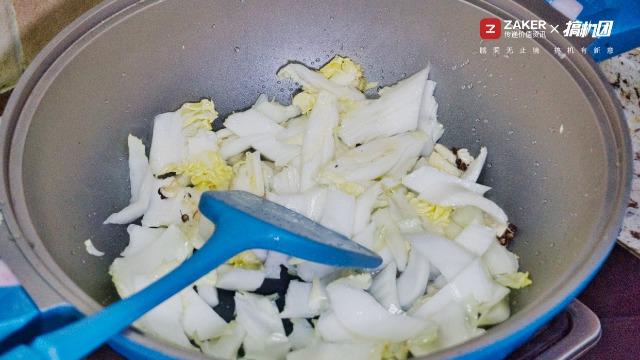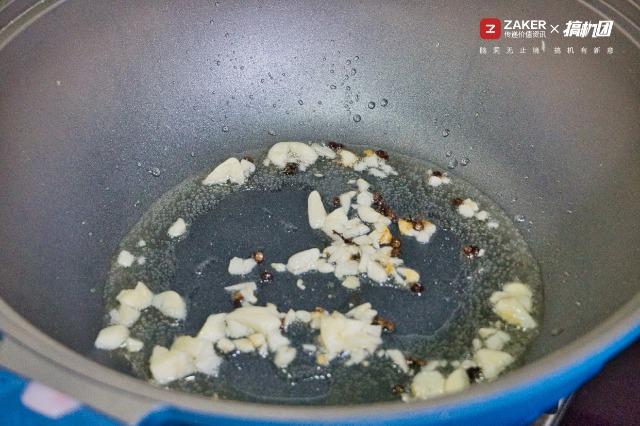 最后來一盤熗炒白菜??村伓伾?,變淺色后,加入食用油,然后加入蒜粒和花椒翻炒出味。
