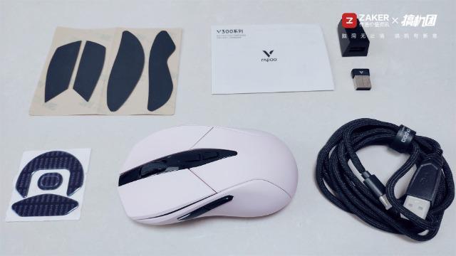開箱詳情內容豐富,包括雷柏V300Pro鼠標一個,電源數據線一根,USB轉換器/接收器一個,備用更換腳貼側裙防滑貼按鍵防滑貼一套,快速開始指南說明書一份。